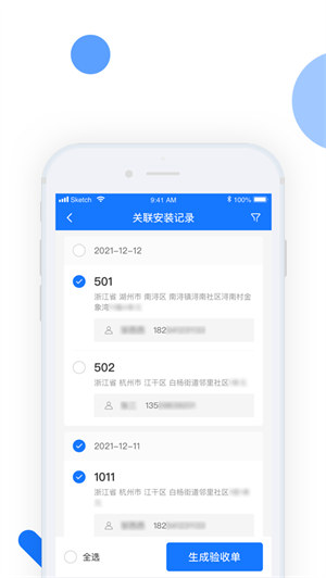 1、实时生成安装记录和验收单,将安装定位详细到日期、门牌号等,让工作变得有效率。