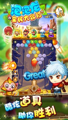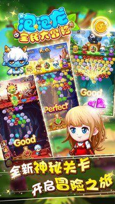 泡泡龙全民大冒险是超级好玩的创新泡泡龙游戏,经典泡泡龙玩法里面加入BOSS战,还有其它丰富特色玩法。多种搞怪道具供你使用,激萌宠物供你选择。魔法快乐之旅由一段美丽的故事带你进入。前所未有的体验,快用你手中的泡泡一起去冒险吧。