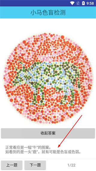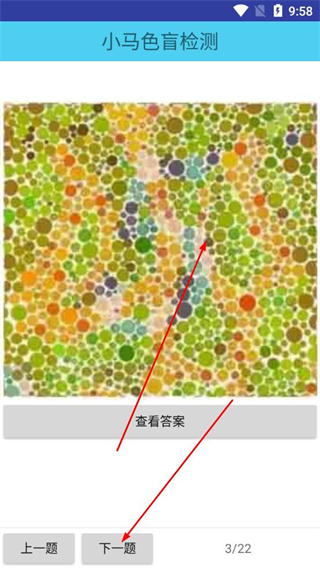 3、可点击下一题继续检测,共22题,完成所有题目后可了解自身色觉情况。