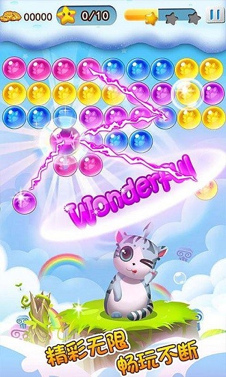 泡泡龙猫咪消消乐是非常好玩的休闲泡泡龙游戏,在这里玩家们要做的就是控制着小猫咪不断的向上抛出小球,相同颜色的三个小球撞到一起就会消除然后得分,玩家们能够不断的得分然后创造新的记录,让玩家们能够在这里找到超好玩的泡泡龙玩法,享受休闲的游戏时光。