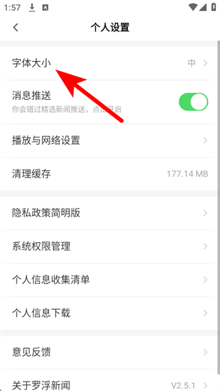 3、在个人设置界面里,点击字体大小选项,进入正文字号设置页面。