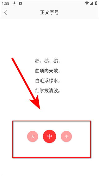 4、在正文字号设置页面,可选择大、中、小字号选项,根据需求选择后即可调整字体大小。