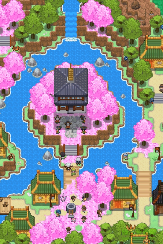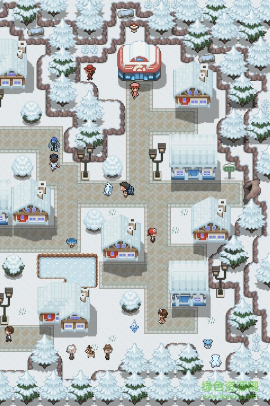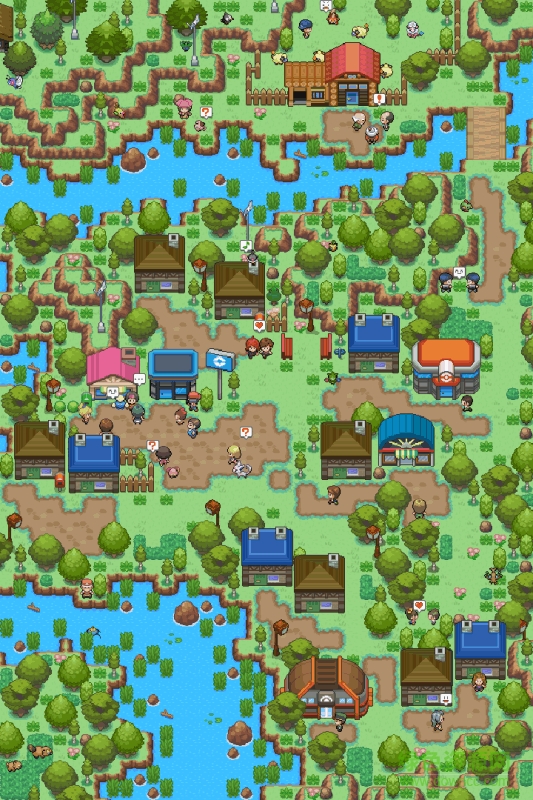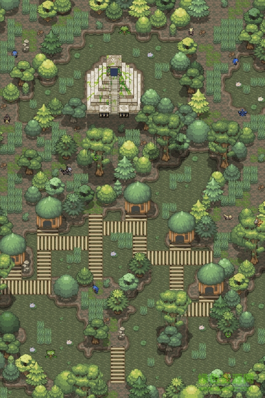 游戏的地图画面如截图所示,我采用了GBA世代的那种纯2D场景和人物的做法,但图块的质量已经不是宝石版那种粗糙的像素了,地图素材我采用了德国的口袋妖怪爱好者“Red-eX“制作的素材图块,这版图块质量是目前我见过最好的,而且他本人也表示可以free to use。