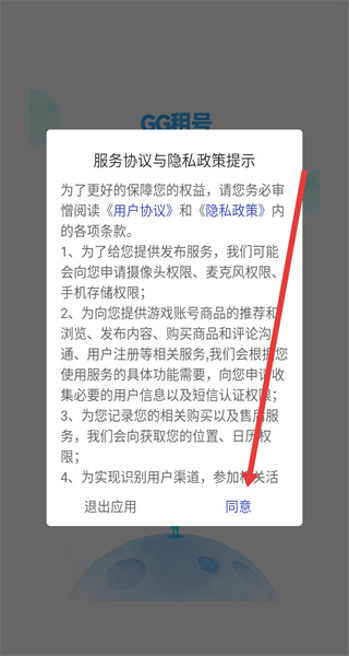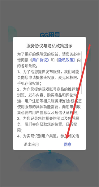 1、在打开GG租号app后,可以通过点击弹窗中的同意按钮,进入使用。
