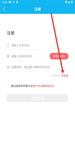 3、在进入到注册页面中,可以点击选择去登录按钮,进行登录。