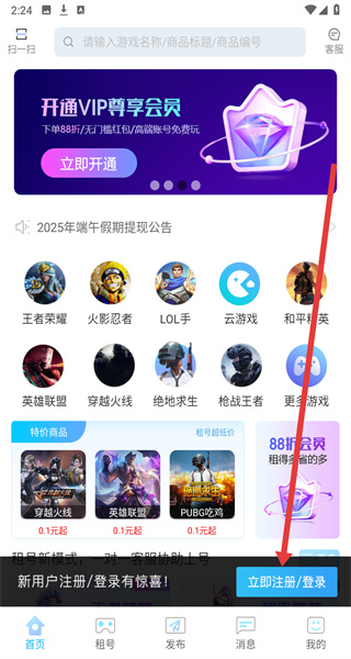 2、在主界面点击“立即注册/登录”,进入注册页面。