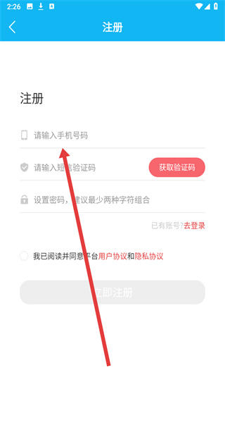 3、可以在注册页面上方的输入框汇中输入手机号码,以便获取验证码进行注册。