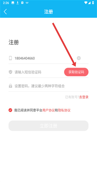4、点击“获取验证码”,输入收到的短信验证码,设置密码后点击“立即注册”,完成注册操作。