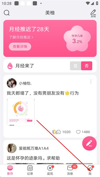 3、进入APP首页,查看距月经开始天数及怀孕几率等信息,浏览用户发帖交流内容,可参与讨论分享经验,借助底部导航栏切换功能模块。