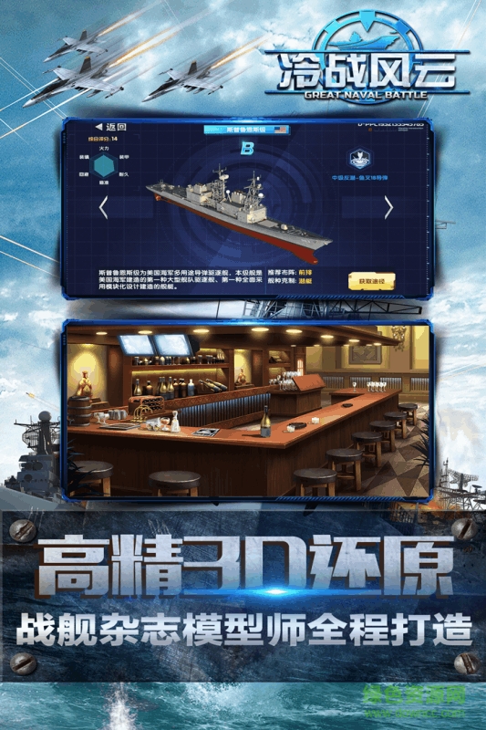 《冷战风云》是一款以“冷战时期”为背景的强策略海战手游。游戏结合近现代海战的导弹式集群作战特点,汇聚冷战时期超级大国苏、美及世界各联盟国的巅峰军事力量,为你打造最强科技战舰,角逐世界海洋霸主!游戏聘用《现代战舰》杂志御用模型师全程3D完美还原建模,融合近现代军演华丽震撼的战斗力,轰爆眼球!世界名将,高科技舰船,舰队指挥官均拥有华丽主动技,组成数种策略搭配方案,任你展现雄才韬略。