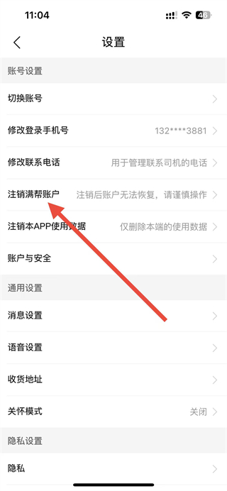 3、在设置页面点击注销满帮账户选项,进入账号注销页面。