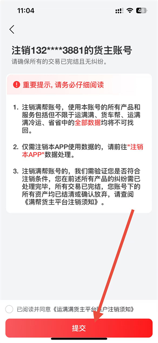 4、在账号注销页面阅读并同意相关须知后点击提交按钮,完成账号注销。