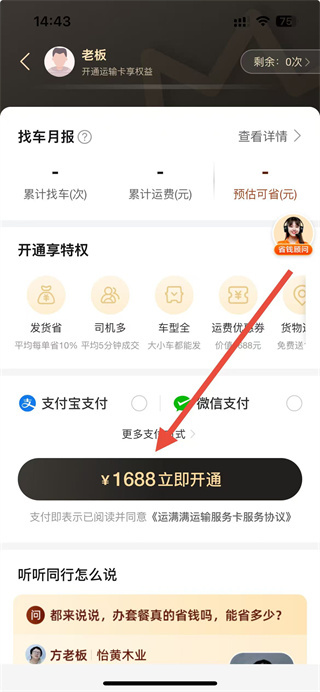 3、在会员开通界面,选择运输服务尊享卡等会员类型。