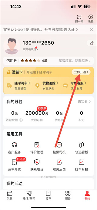 2、在个人页面中,找到运输卡区域的立即开通选项并点击,进入会员开通界面。