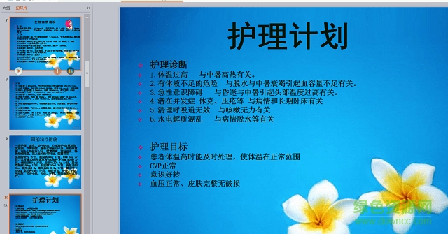 护理查房 护理查房范文ppt提供了各类临床病例的详细范文让你学习,拥有众多护理知识能够达到不错的知识掌握效果,为不同的医学部门带来了相应的查房护理课件,能够实现自主学习效果,也能够进行互动讲课,实现不错的教学服务,其内的知识十分全面,能够很好的带来最有用的内容! 查看更多>> 腰椎间盘突出护理查房ppt 900KB/中文/5.0/免费版下载 尿毒症的护理查房ppt 234KB/中文/5.0/免费版下载 小儿腹泻的护理常规ppt 673KB/中文/5.0/免费版下载 慢性肾功能衰竭病人的护理ppt 11.65M/中文/5.0/免费版下载 肺癌患者的护理查房PPT 2.24M/中文/5.0/免费版下载 乳腺癌术后护理查房ppt 1.95M/中文/5.0/免费版下载