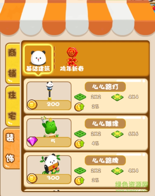 每一个装饰都有下面的属性:占地面积、加成范围、加成数值、售价。