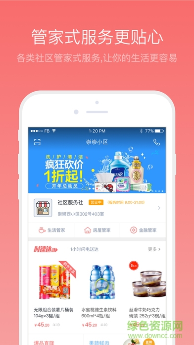 实惠服务社app是一款非常便捷的社区服务手机软件,有了它以后,用户就可以在手机上进行购物、充值、维修、家政等服务了,让您的社区生活更加便捷美好,喜爱的朋友赶快到绿色资源网下载使用吧!