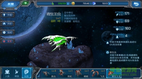 寄生王虫:虫族高级空中单位,只能对地面攻击,不但输出惊人,而且射程也很远,只有对空单位能堆它很好克制。