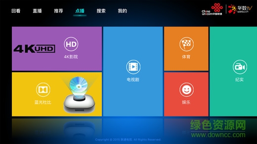 包含4K影院、蓝光杜比、电视剧、名栏目、娱乐等十二大栏目