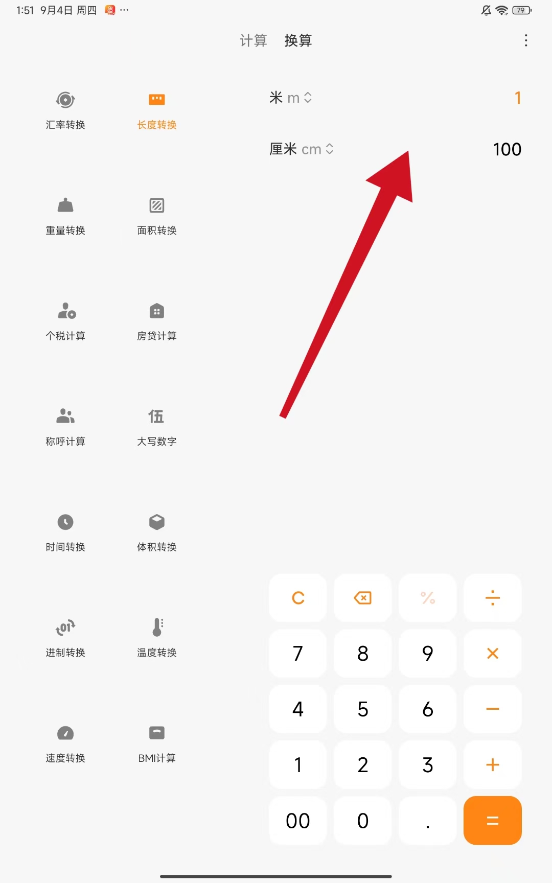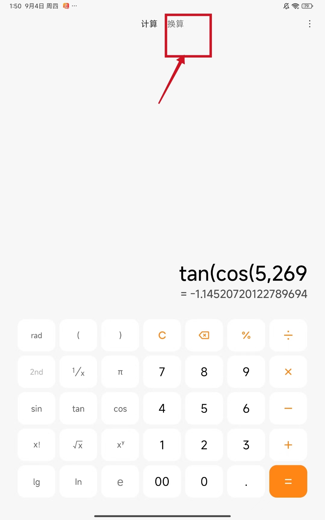 1、打开小米手机中的计算器应用,点击界面上方的换算选项进入换算功能页面。