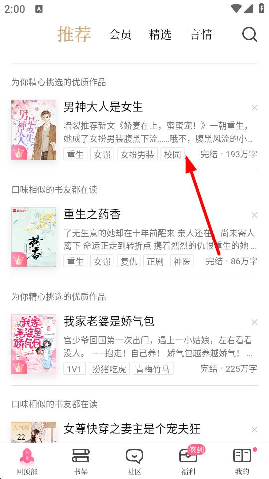 1、打开红袖读书App,在推荐页面中找到并点击小说男神大人是女生。