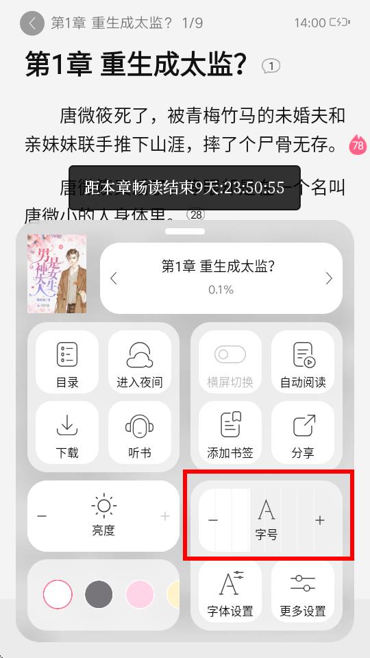 4、在小说阅读界面点击屏幕,唤出设置菜单,点击字号区域的加号或减号按钮,即可增大或减小字体大小。