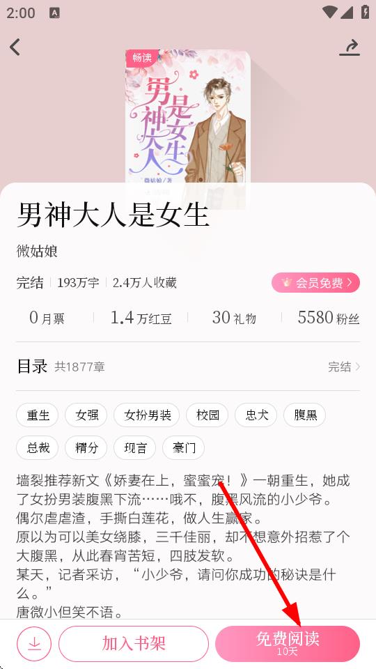 2、进入男神大人是女生小说详情页后,点击下方的免费阅读按钮。