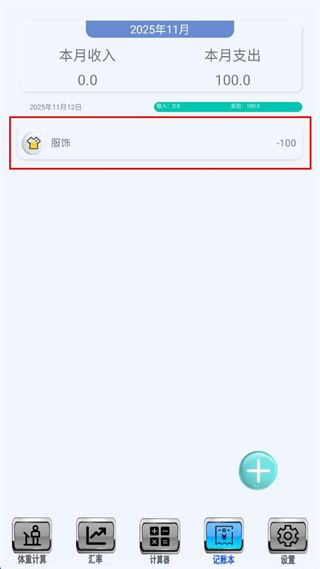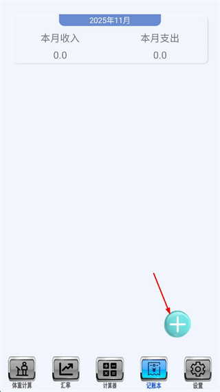 2、在记账本页面点击右下角的加号按钮,进入支出记录页面。