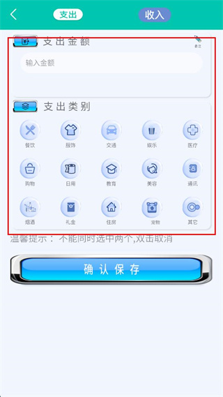 3、在支出记录页面输入支出金额,选择支出类别,如服饰等。