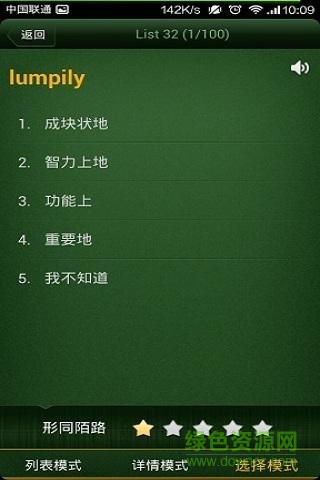 3、标记单词熟练度:你可以点击页面下方的熟练度星级,给每个单词标记属于你自己的单词熟练度级别(从一星到五星),同时可以针对熟练度对单词进行筛选,强化不熟练的单词。