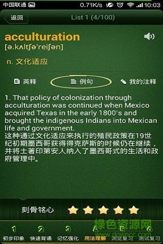 4、查看中、英文释义:例句和添加注释:你可以方便地查看到每个单词的释义和中英文对照的例句,并对每个单词添加你自己在背诵过程中的想法。