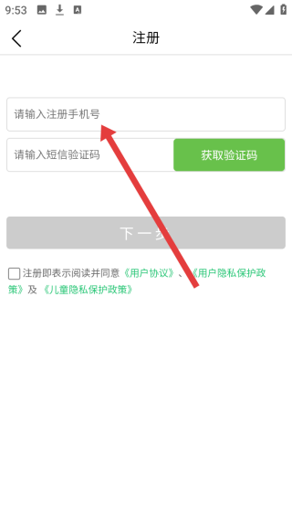 3、在进入到注册页面后,点击输入框填写手机号,获取验证码后完成注册操作。