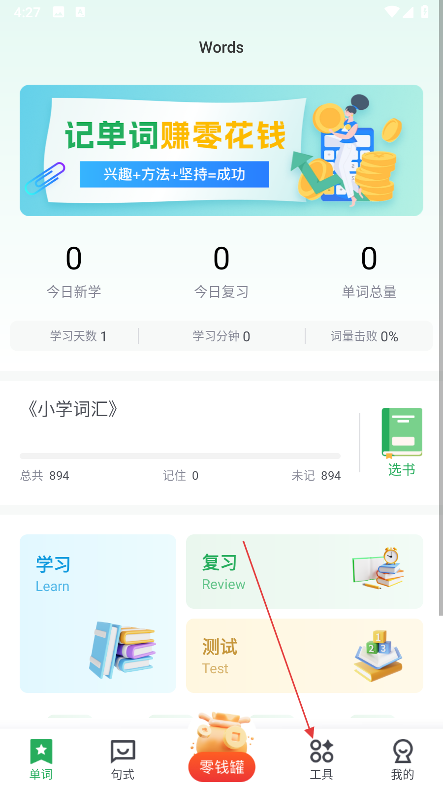 1、打开芝麻单词APP,点击页面底部工具选项,进入工具页面。