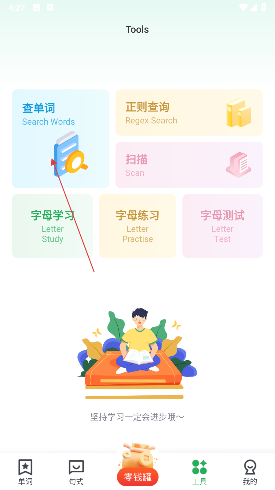 2、在工具页面中,点击查单词选项,进入查单词界面。