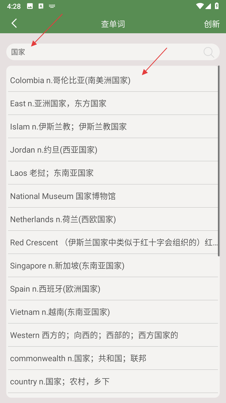 3、在查单词界面的搜索框中输入要查询的单词,下方会显示相关单词列表。