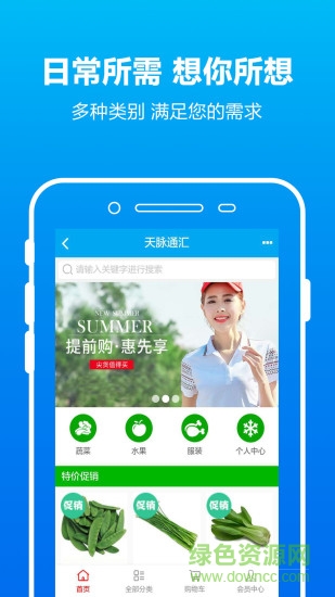 天脉通汇安卓版是一款便捷消费app,包括了蔬菜、水果、服装等商品,每天还有超多促销商品推出,轻松省钱购物,欢迎大家到绿色资源网下载使用!