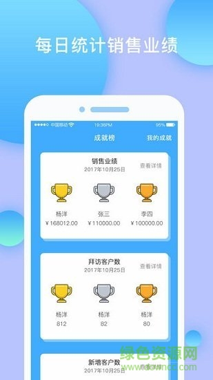 成就排行榜,让每个业务人员通过手机了解到每个人的销售业绩,拜访次数,拜访客户数,新增客户数