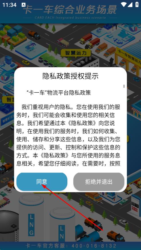 1、打开卡一车APP,在弹出的隐私政策授权提示页面,点击同意。
