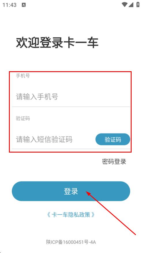 2、进入欢迎登录卡一车页面,输入手机号,填写验证码。