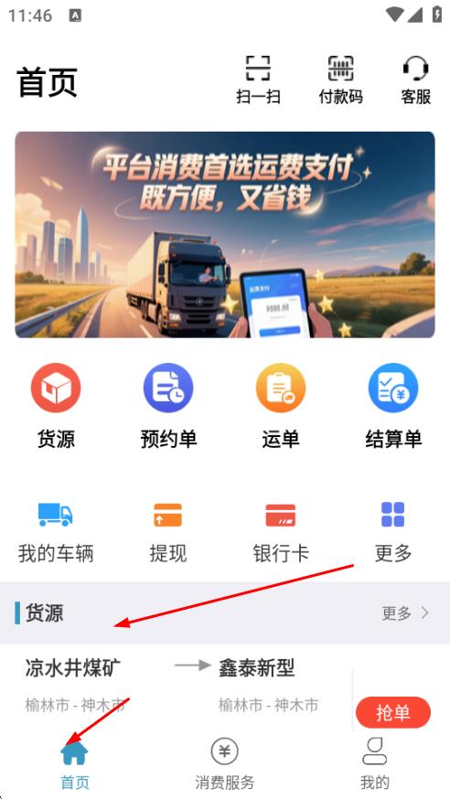 4、登录成功后,进入APP首页,即可开始使用,在首页货源板块查找合适货源。