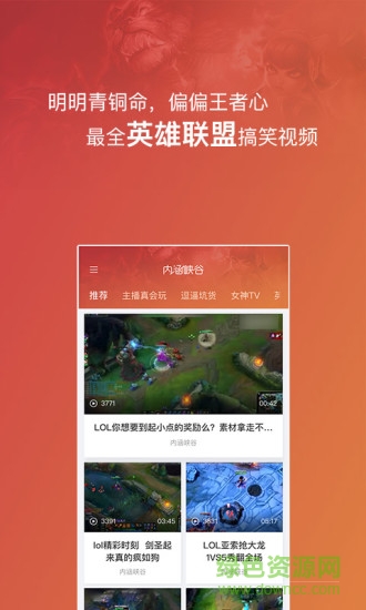 内涵峡谷app是一款专为lol英雄联盟打造的手机视频站,海量lol视频资源让你一次看个够、搞笑集锦、高手过招、大神操作,还等什么,快约上你的小伙伴,一起来绿色资源网踊跃下载吧!