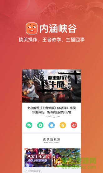 在一个夜黑风高的晚上,峡谷召唤师的河道里除了寂静还是寂静,盖伦和亚瑟手牵着手,做了一些羞羞的事情,然后内涵峡谷,LOL、荣耀短视频平台,就横空出世了。 内涵峡谷,专注于游戏短视频,支持英雄联盟、荣耀。 海量的优质短视频数据,大数据智能推荐引擎,让你看不够; 搞笑集锦、大神操作、视频教学、主播逗逼、大胸女神,应有尽有; 干净简洁的播放体验,深度沉浸在短视频的乐趣中