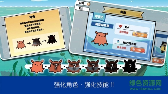 除了游戏初期的角色萌哒哒章鱼以外,还有很多拥有各种技能的可爱角色。根据角色的不同,技能的种类和强度,基础体力也不同。可以使用在游戏中获得的虾,解锁隐藏的角色吧