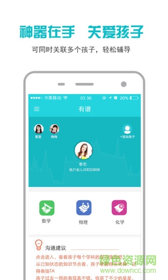 有谱家长版app是专为学生家长用户打造的家校互联软件。家长们可以使用本软件在线查看孩子的学习状态,能够绑定多个孩子的账号信息。实时监督孩子完成作业情况,还可以和校方老师交流互动哦!快来绿色资源网下载吧。