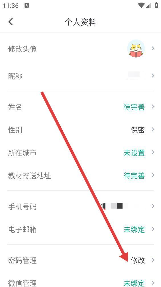 3、在个人资料界面里,找到并点击密码管理选项,进入修改密码界面。