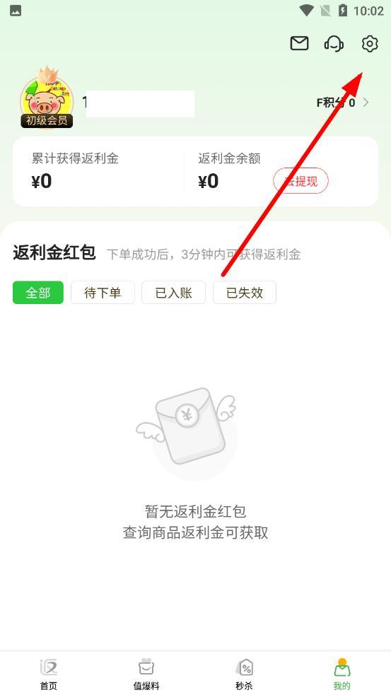 1、打开返利网app点击底部导航栏中的我的选项,进入个人页面,在页面右上角找到设置图标进入设置界面。