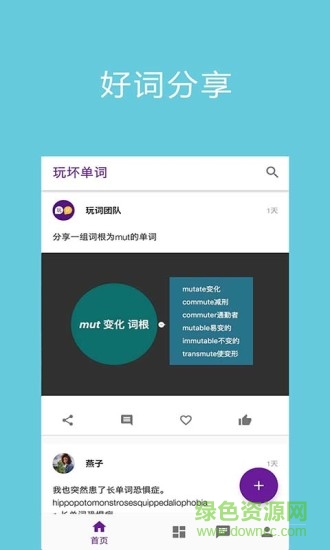 玩坏单词app是一款可以快速记忆英语单词的学习软件。小伙伴们在学习英语课程中如果遇到了有趣的单词,可以在线分享给其他学员,让记单词变成一件有意义的事!欢迎来绿色资源网下载体验。