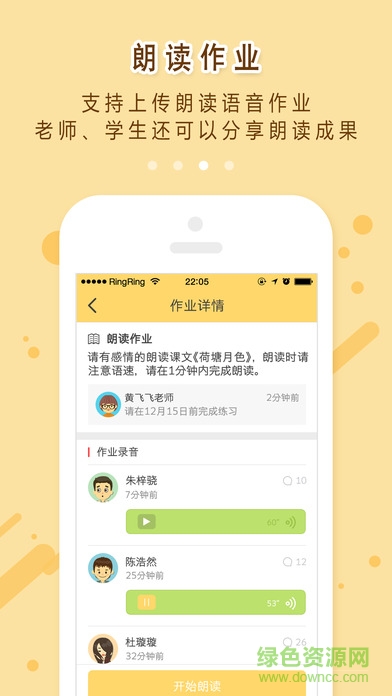 作业:实现作业的发送和接收。另外,老师可以布置朗读作业,学生们上传朗读语音全班共享。