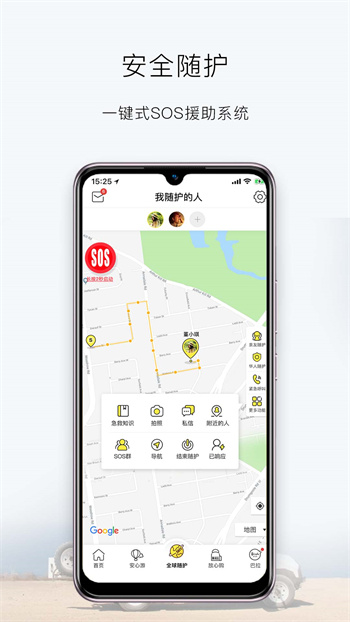 用户自主发出,全球在线随护,守护亲友安全。紧急情况下,可使用SOS一键求助功能,即刻通知您的紧急联系人,或召集附近的人提供帮助。