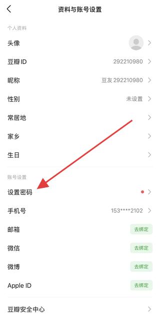 3、在资料与账号设置页面中找到设置密码选项并点击,进入设置密码页面。